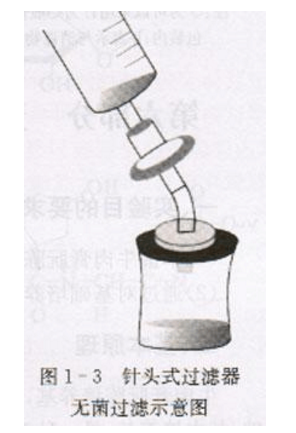 將滅菌濾器的進口在無菌條件下以無菌操作方法銜接于裝有待濾溶液(2%葡萄糖溶液)的注射器上,將針頭與出口處銜接并刺進帶橡皮塞的無菌容器中(圖1一3)。 3.壓濾